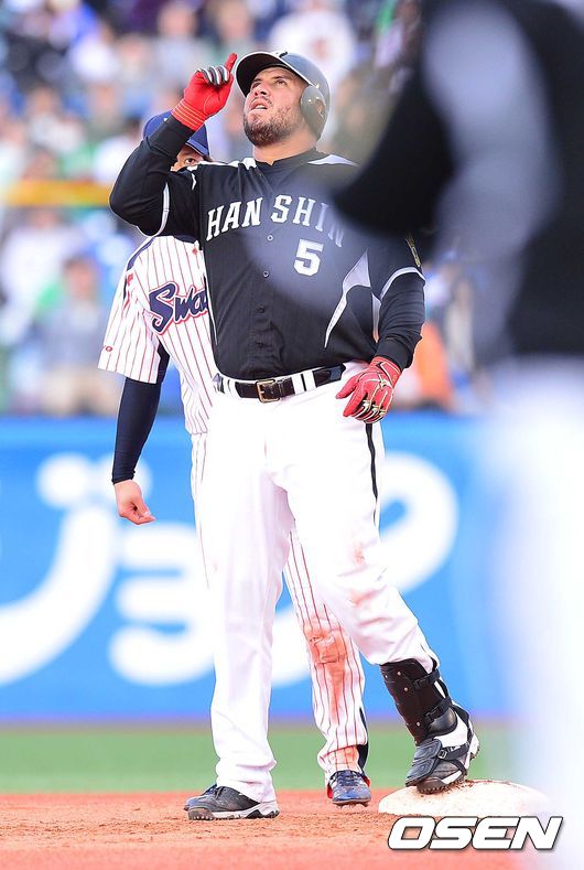 7회초 한신 공격 1사 1, 3루 상황 마우로 고메즈가 추격의 2타점 좌익선상 2루타를 날리고 2루에 안착해 환호하고 있다.