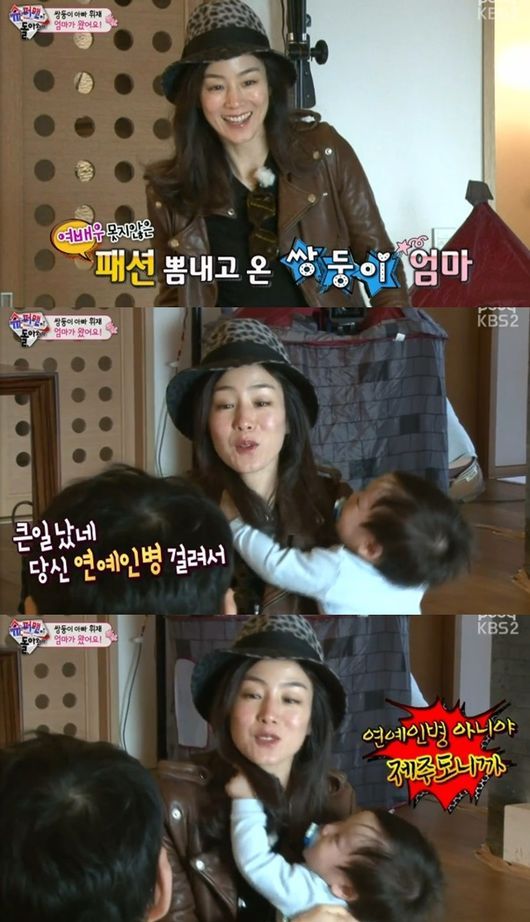 이에 문정원은 "연예인병이 아니라, 제주도에 와서 그렇다"며 "아기들이 모자를 쓴 엄마를 좋아한다"고 변명해 눈길을 끌었다.