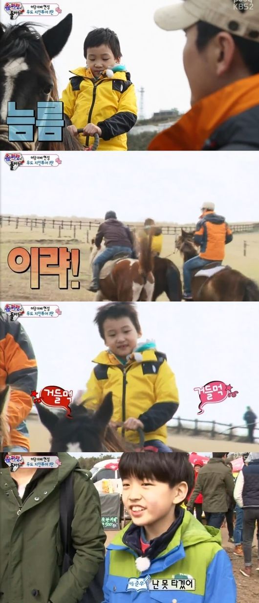 준우는 "나는 겁 많아서 못해"라고 말했다. 준우는 이후 말을 탄 이후 정신이 반쯤 나간 표정을 지어 엄마, 아빠를 웃음짓게 했다.