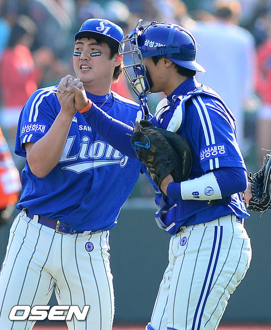 경기를 마치고 삼성 안지만과 이흥련이 하이파이브를 하고 있다. / rumi@osen.co.kr