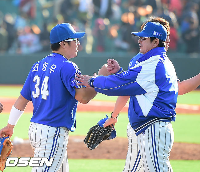 경기를 마치고 삼성 류중일 감독이 최형우와 하이파이브를 하고 있다. / rumi@osen.co.kr