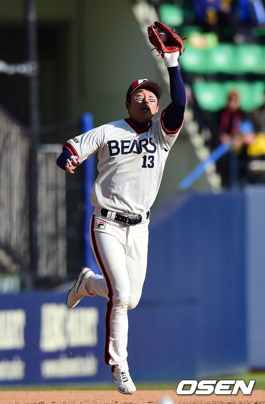 6일 오후 서울 잠실구장에서 열린 '2014 한국야쿠르트 세븐 프로야구' 두산 베어스와 KIA 타이거즈의 경기 9회초 2사 2루 필의 땅볼을 허경민이 잡고 있다. 허경민이 1루로 송구 아웃.