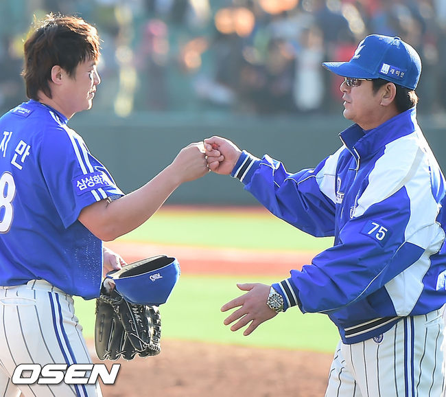 경기를 마치고 삼성 류중일 감독이 안지만과 하이파이브를 하고 있다. / rumi@osen.co.kr