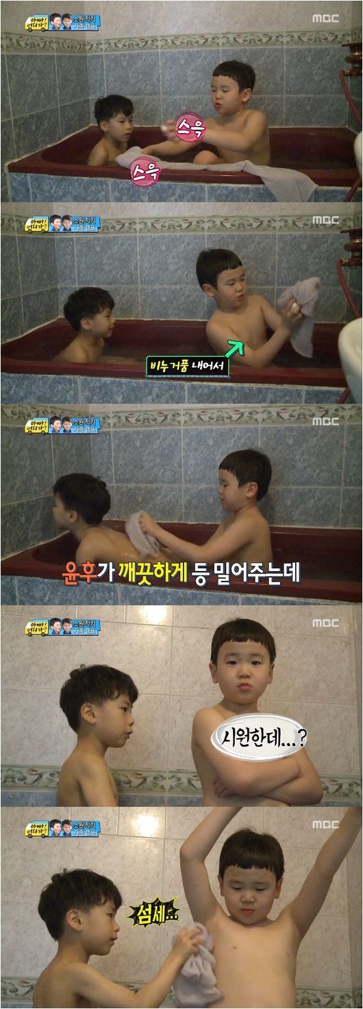 매일 부모의 도움 하에 목욕을 하다가 아이들끼리 서로 도우며 목욕을 하는 모습은 시청자들을 흐뭇하게 했다. 아 아이들은 의좋은 형제처럼 함께 목욕을 하며 시간을 보냈다.