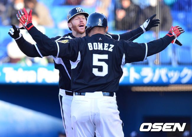 8회초 한신 공격 1사 1, 2루 상황 맷 머튼이 역전 좌월 스리런을 작렬시키고 홈을 밟은 뒤 고메즈와 인사를 나누고 있다.
