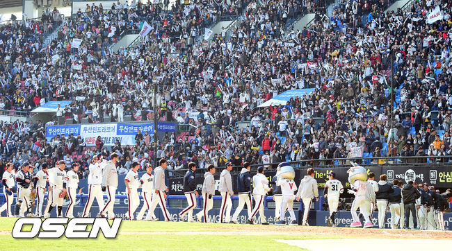 6일 오후 서울 잠실구장에서 열린 '2014 한국야쿠르트 세븐 프로야구' 두산 베어스와 KIA 타이거즈의 경기종료, 두산 선수들이 관객들에게 인사를 하고 덕아웃으로 향하고 있다.