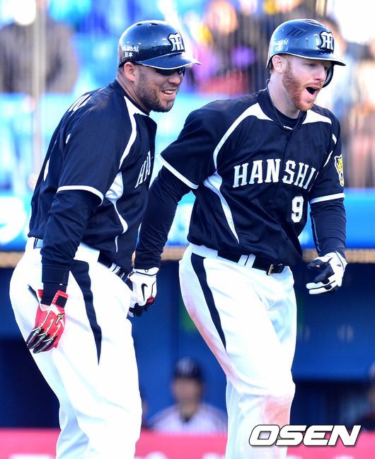8회초 한신 공격 1사 1, 2루 상황 맷 머튼이 역전 좌월 스리런을 작렬시키고 홈을 밟은 뒤 고메즈와 인사를 나누고 있다.