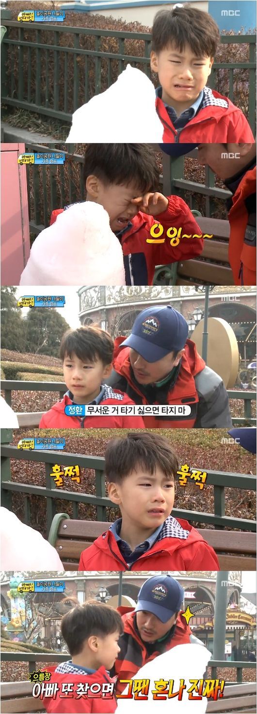 앞서 회전목마도 무섭다면서 눈물을 흘렸기에 안정환은 독한 마음을 먹고 아들에게 불호령을 내렸다. 안리환은 눈물을 흘리면서 “무섭다”고 했다. 안정환은 별로 무섭지 않은 것에 겁을 먹는 아들을 보며 안타까움을 숨기지 못했다.