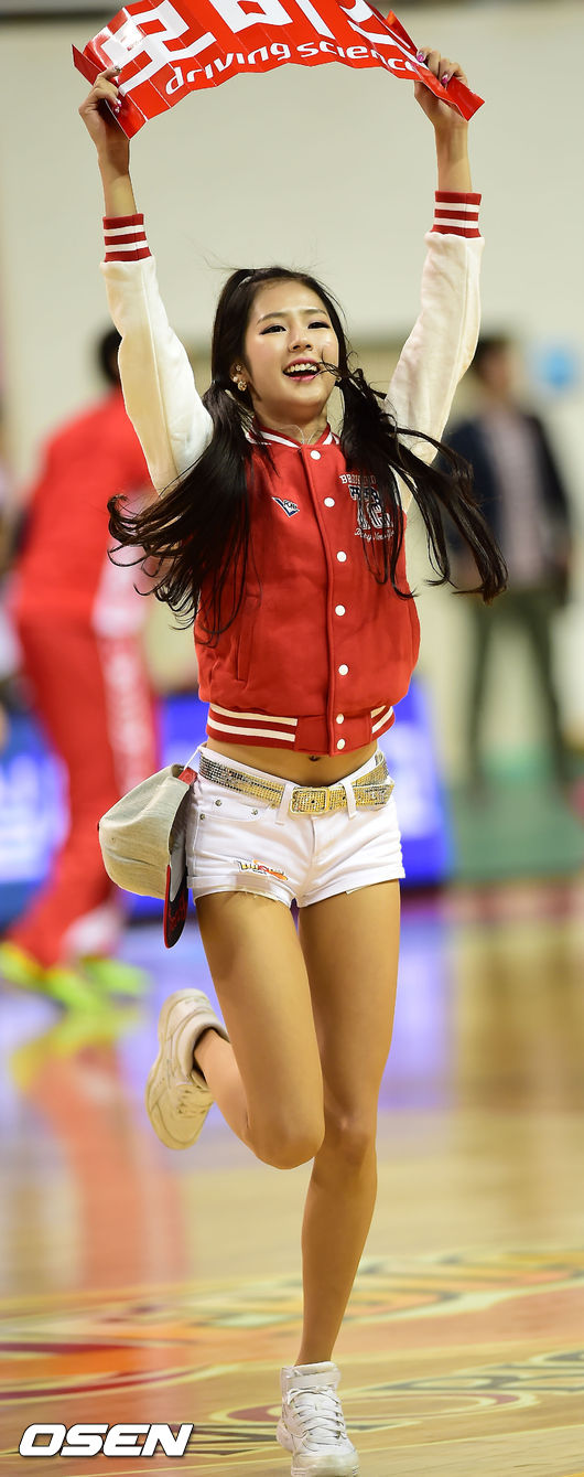 6일 오후 울산광역시 중구 동천체육관 열린 'KB 국민카드 2013-2014 프로농구' 울산 모비스와-창원 LG의 챔피언결정 4차전, 경기전 모비스 치어리더 박기량이 코트 위에서 열띤 응원을 펼치고 있다.