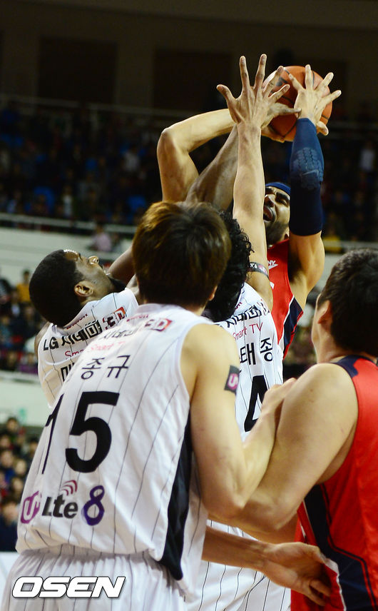 6일 오후 울산광역시 중구 동천체육관 열린 'KB 국민카드 2013-2014 프로농구' 울산 모비스와-창원 LG의 챔피언결정 4차전, 1쿼터 모비스 문태영이 LG 메시와 문태종에게 블로킹을 당하고 있다.