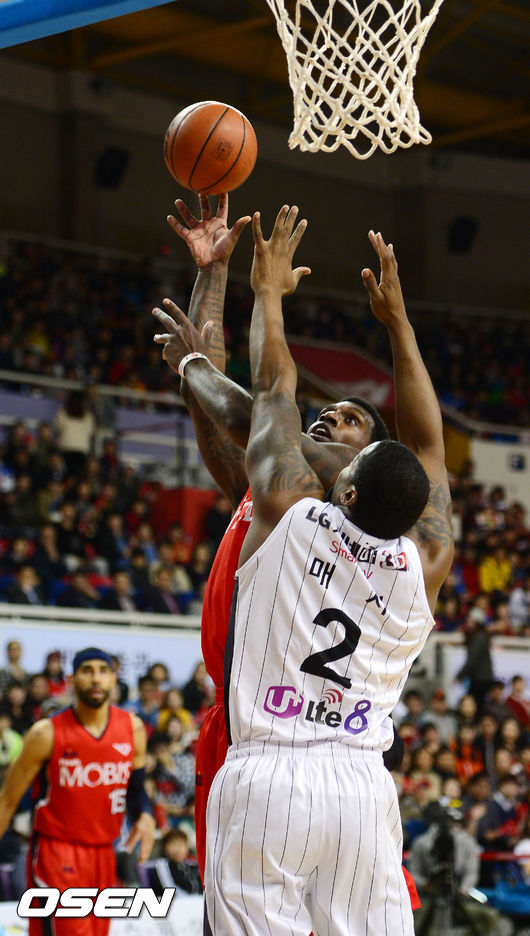 6일 오후 울산광역시 중구 동천체육관 열린 'KB 국민카드 2013-2014 프로농구' 울산 모비스와-창원 LG의 챔피언결정 4차전, 1쿼터 모비스 라틀리프가 LG 메시의 블로킹을 피해 골밑슛을 성공시키고 있다.