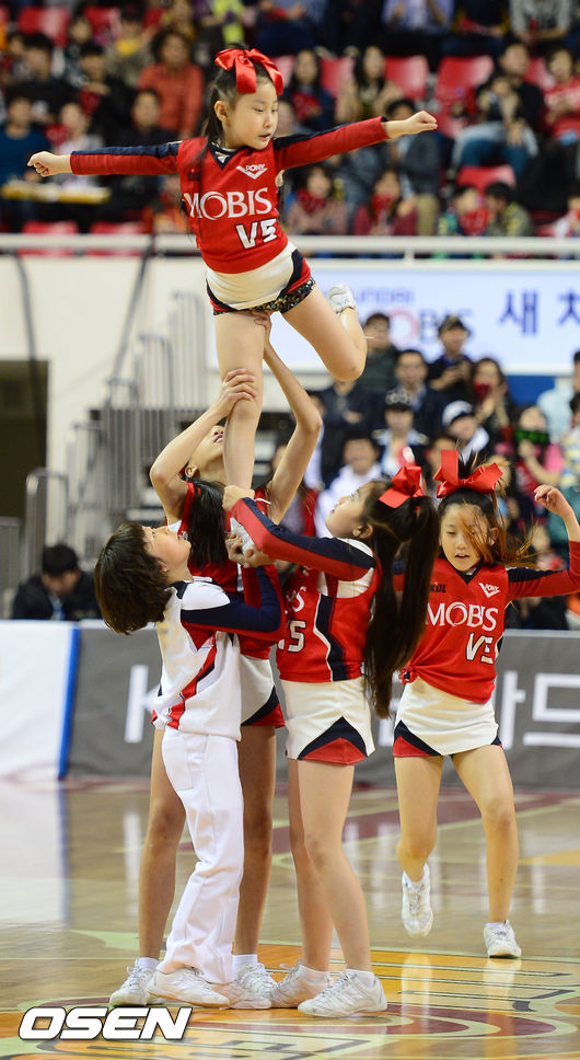 6일 오후 울산광역시 중구 동천체육관 열린 'KB 국민카드 2013-2014 프로농구' 울산 모비스와-창원 LG의 챔피언결정 4차전, 코트 위에서 어린이 치어리더단 레인보우의 공연이 펼쳐지고 있다.