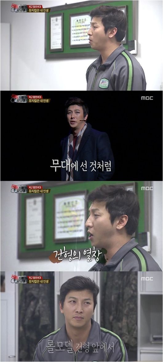 박건형은 6일 방송된 MBC 예능프로그램 ‘일밤-진짜사나이’에서 뮤지컬 배우가 꿈인 임창빈 이병을 위해 고 김광석의 ‘그날들’을 열창했다.
