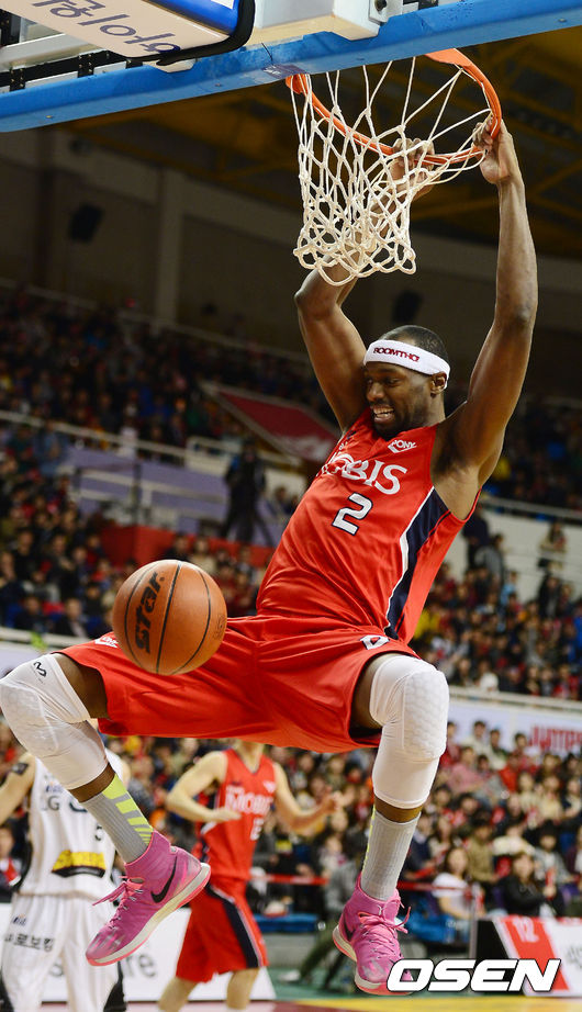 6일 오후 울산광역시 중구 동천체육관 열린 'KB 국민카드 2013-2014 프로농구' 울산 모비스와-창원 LG의 챔피언결정 4차전, 2쿼터 모비스 로드벤슨이 투핸드 덩크슛을 내리꽂고 있다.
