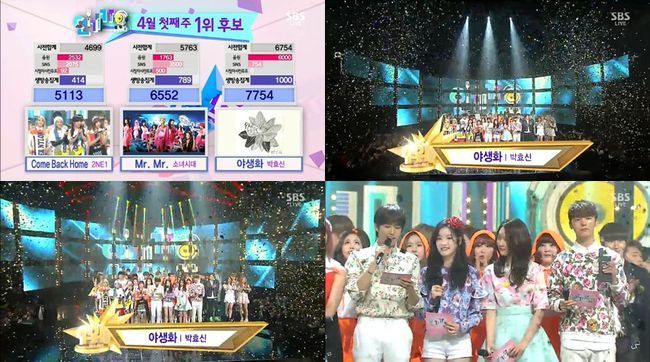 박효신은 이날 '인기가요'에서 타이틀곡 '야생화'로 소녀시대 '미스터 미스터'와 투애니원 '컴백홈'을 제치고 1위를 차지했다. 그러나 전날 방송된 '음악중심'과 마찬가지로 '인기가요'에 역시 모습을 드러내지 않은 상황.