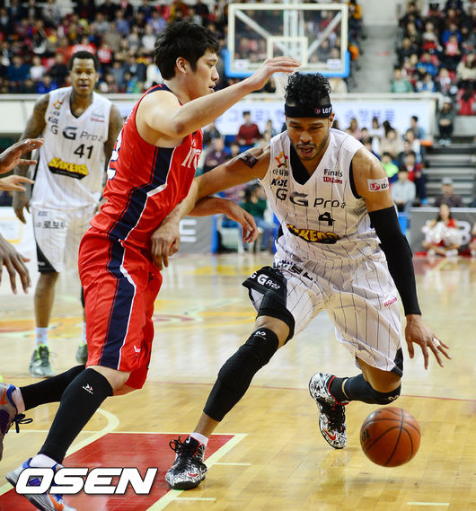 6일 오후 울산광역시 중구 동천체육관 열린 'KB 국민카드 2013-2014 프로농구' 울산 모비스와-창원 LG의 챔피언결정 4차전, 3쿼터 LG 문태종이 모비스 함지훈을 돌파하려 하고 있다.