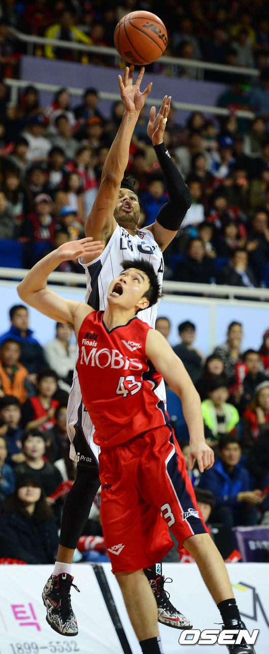 6일 오후 울산광역시 중구 동천체육관 열린 'KB 국민카드 2013-2014 프로농구' 울산 모비스와-창원 LG의 챔피언결정 4차전, 3쿼터 LG 문태종이 3점슛을 할때 모비스 이대성이 블로킹을 시도하고 있다.