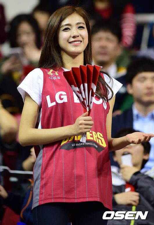 6일 오후 울산광역시 중구 동천체육관 열린 'KB 국민카드 2013-2014 프로농구' 울산 모비스와-창원 LG의 챔피언결정 4차전, LG 치어리더 김연정이 관중석에서 환한 미소로 응원을 하고 있다.