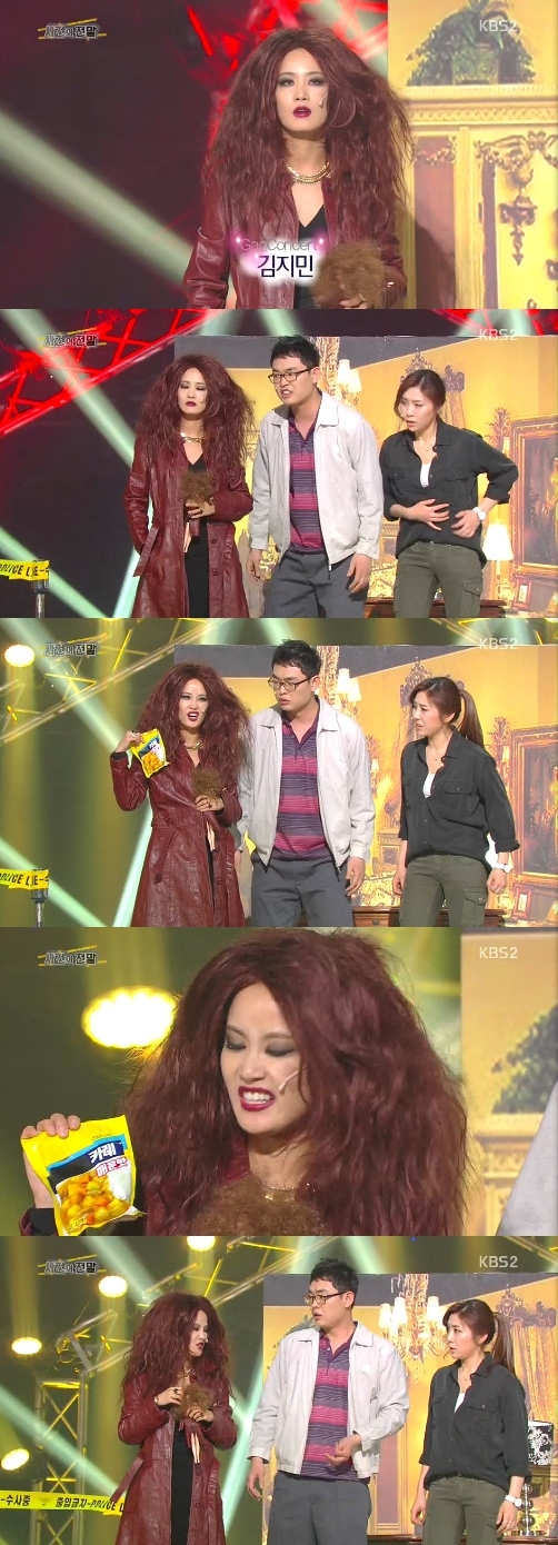 마지막으로 김지민은 추가 범행을 걱정하는 박영진 앞에 “시간이 다 됐군. 곧 유괴할거예요”라고 말해 관심을 한 몸에 받았다. 그러나 이내 “드라마 곧 6회 할 거예요. 드라마 4회 5회 6회. 말 좀 한번에 알아먹여요. 정도전 겁나 섹시해”라고 덧붙여 모두를 폭소케 했다.