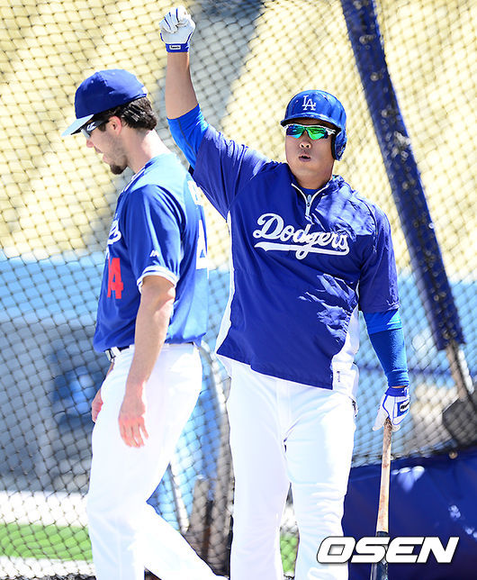 경기에 앞서 다저스 류현진이 배팅 훈련 도중 큼지막한 타구를 날리며 즐거워하고 있다.