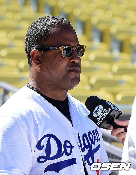 경기에 앞서 다저스에서 선수생활을 한 라울 몬데시가 인터뷰를 하고 있다.