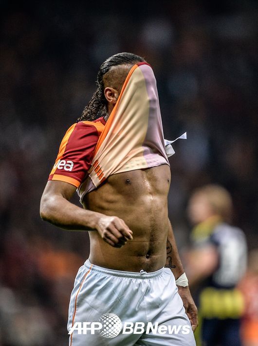[OSEN=스포츠부] 갈라타사라이의 공격수 디디에 드록바(36)가 경기 도중 유니폼을 얼굴에 뒤집어 쓰고 있다.
