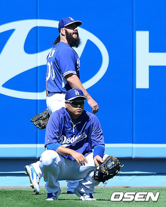 경기에 앞서 다저스 류현진과 윌슨이 연습 타구를 지켜보고 있다.