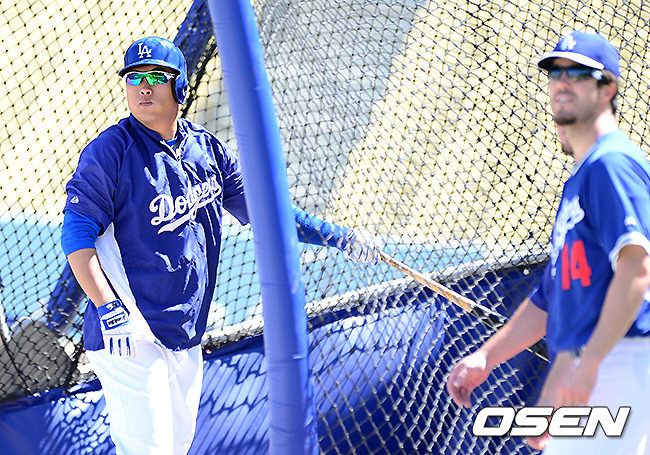 경기에 앞서 다저스 류현진이 배팅 훈련을 하며 큼지막한 타구를 날리고 있다.