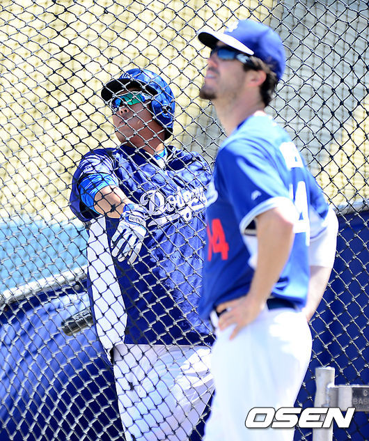 경기에 앞서 다저스 류현진이 배팅 훈련을 하고 있다.