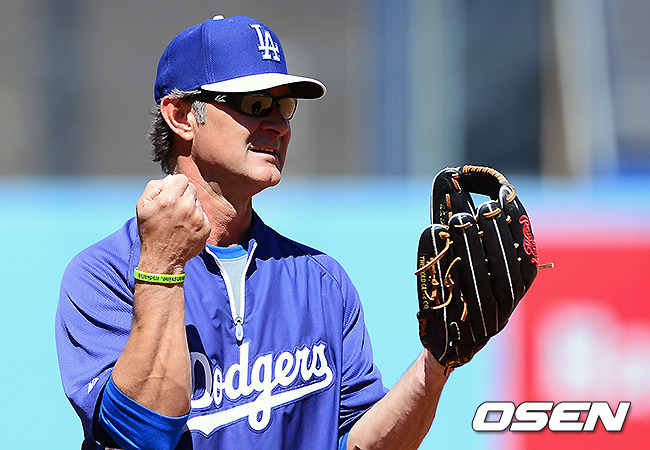 경기에 앞서 다저스 매팅리 감독이 선수들 훈련을 돕고 있다.