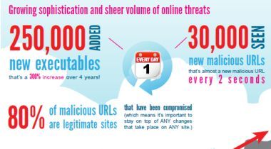 멀웨어가 매일 25만개 이상이 생성되고 있으며 이는 지난 4년 전에 비해 300% 이상 증가한 수치다. 또 악성 URL이 매일 3만여 개, 즉 2초마다 새롭게 발견되고 있다.