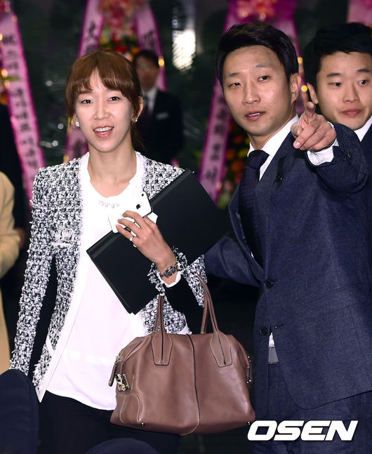 7일 오전 서울 세종문화회관 세종홀에서 진행된 이규혁의 국가대표 은퇴식에서 이규혁과 조해리가 인사를 나누고 있다.