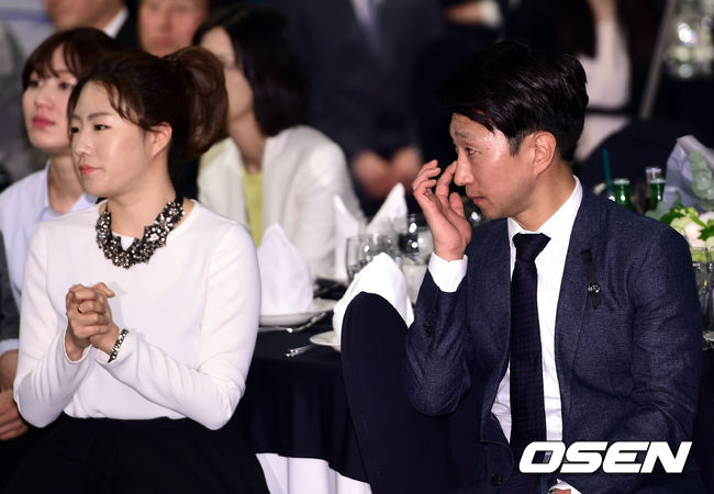 7일 오전 서울 세종문화회관 세종홀에서 진행된 이규혁의 국가대표 은퇴식에서 이규혁이 영상을 보며 눈물을 흘리고 있다.