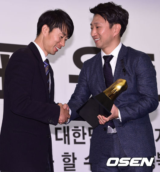 7일 오전 서울 세종문화회관 세종홀에서 진행된 이규혁의 국가대표 은퇴식에서 이규혁이 제갈성렬 해설위원의 축하를 받고 있다