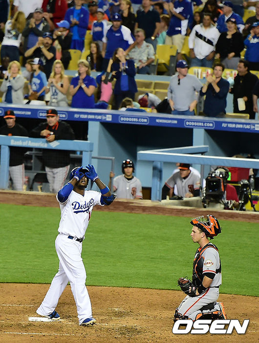 8회말 2사에서 다저스 라미레즈가 솔로포를 날리고 세레모니를 하고 있다. / jpnews@osen.co.kr
