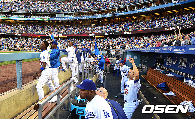 4회말 1사 2루에서 다저스 멧 켐프가 연타석 홈런을 날리고 더그아웃의 동료선수들이 열광하고 있다. / jpnews@osen.co.kr