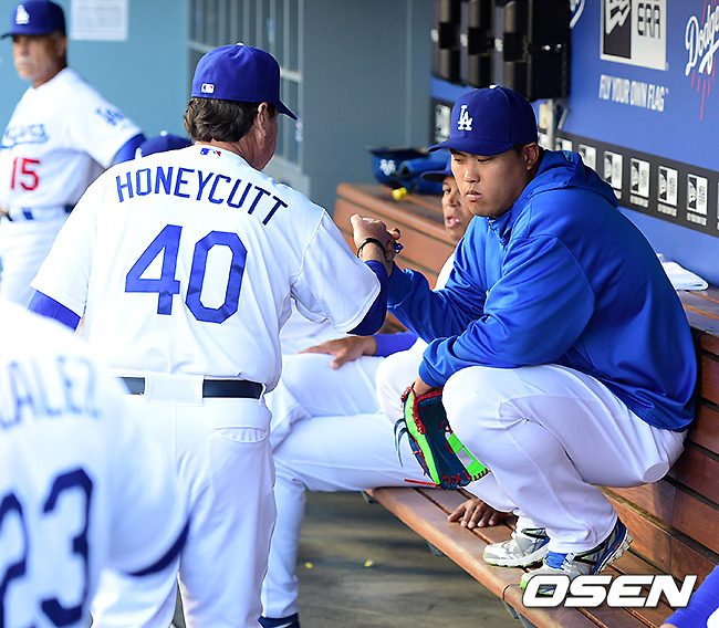 경기에 앞서 다저스 허니컷 코치와 류현진이 주먹을 맞대고 있다. / jpnews@osen.co.kr