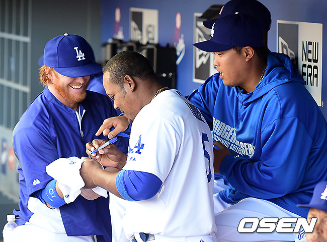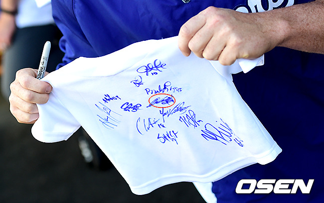 경기에 앞서 다저스 터너가 아기 옷에 선수들 사인을 받으며 들어 보이고 있다. / jpnews@osen.co.kr