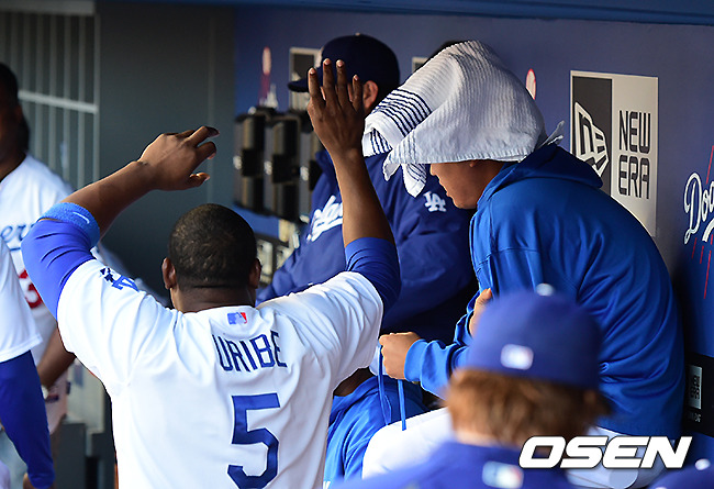 경기에 앞서 다저스 유리베, 류현진이 더그아웃에서 장난을 치고 있다. / jpnews@osen.co.kr