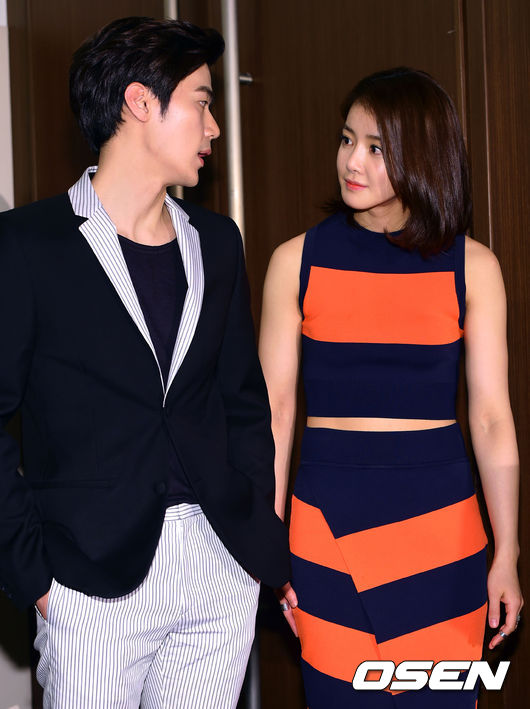7일 오후 서울 여의도 63빌딩 주니퍼룸에서 열린 KBS 수목드라마 '골든크로스'(유현미 극본/홍석구 연출/팬 엔터테인먼트 제작) 제작발표회에서 이시영과 김강우가 이야기를 나누고 있다.
