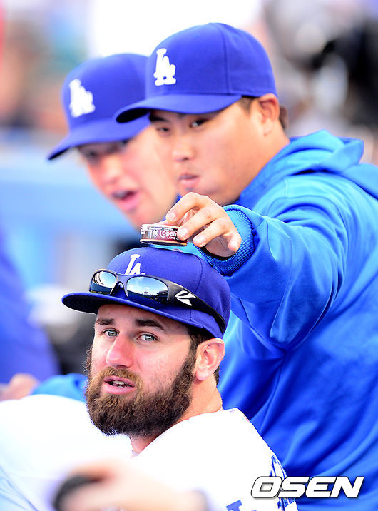 다저스 커쇼와 류현진이 스캇 밴 슬라이크에 장난을 치고 있다. / jpnews@osen.co.kr