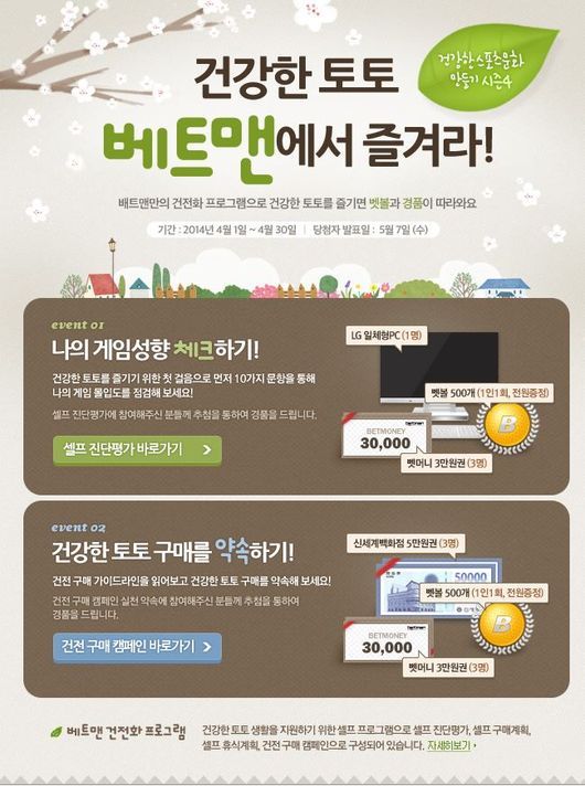 '셀프진단평가' 참여 회원에게는 일체형PC(1명)와 벳머니 3만 원권(3명)을, '건강한 토토 구매를 약속하기' 이벤트에 참여한 사람에게는 신세게 백화점상품권 5만 원권(3명)과 벳머니 3만 원권(3명)을 추첨을 통해 나눠준다.