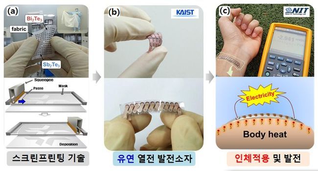미래창조과학부는 7일 한국과학기술원(KAIST) 연구진이 웨어러블 전자기기(wearable electronics)의 전력공급원으로 사용할 수 있는 '입을 수 있는 열전소자'를 개발했다고 밝혔다.