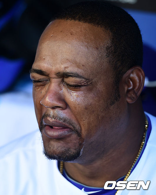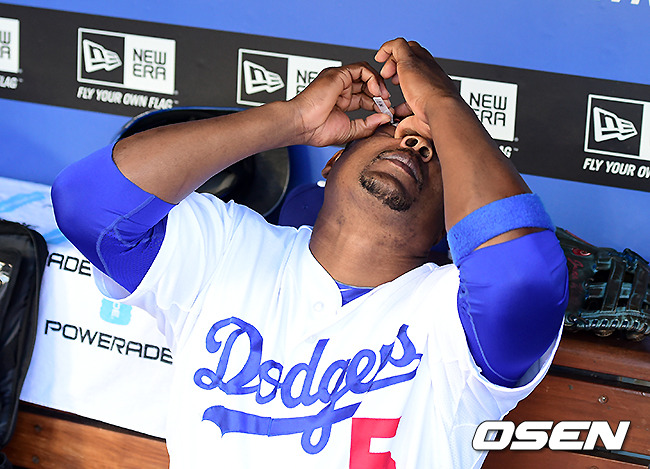 경기에 앞서 다저스 유리베가 안약을 넣고 눈물 흘리는 표정을 짓고 있다. / jpnews@osen.co.kr