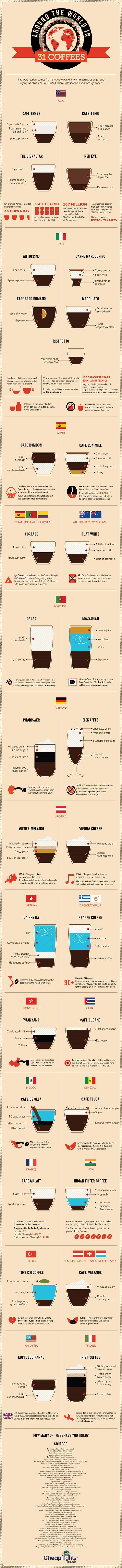 영국의 세계 항공편 정보 사이트 '칩 플라이트(Cheap Flights)'가 세상의 31가지 커피 마시는 법을 이미지로 공개해 이목을 집중시키고 있는 것.