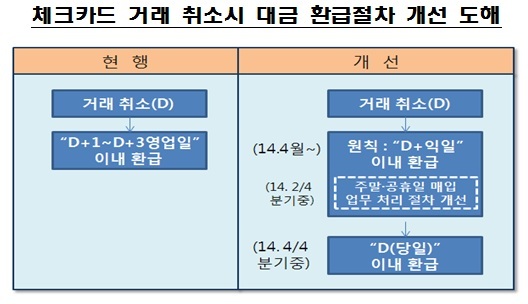 이를 통해 체크카드 결제를 취소하면 최대 6일까지 걸렸던 대금 환급이 이달부터는 결제 다음날 이내로 빨라진다.