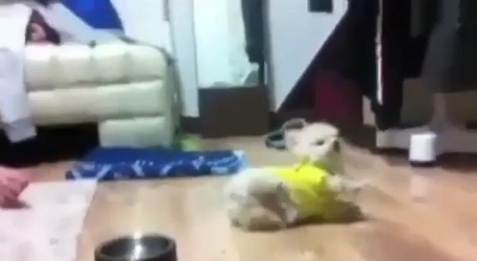 3분 40초의 동영상에는 밥그릇에 담긴 투명한 액체를 마신 강아지가 제대로 서지 못하고 비틀거리는 등 전형적으로 술에 취해 몸을 가누지 못하는 모습이 담겨 있다.
