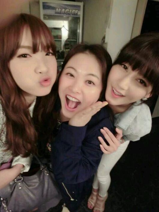 개그우먼 심진화가 걸그룹 레인보우의 김지숙, 오승아와 다정샷을 찍었다.