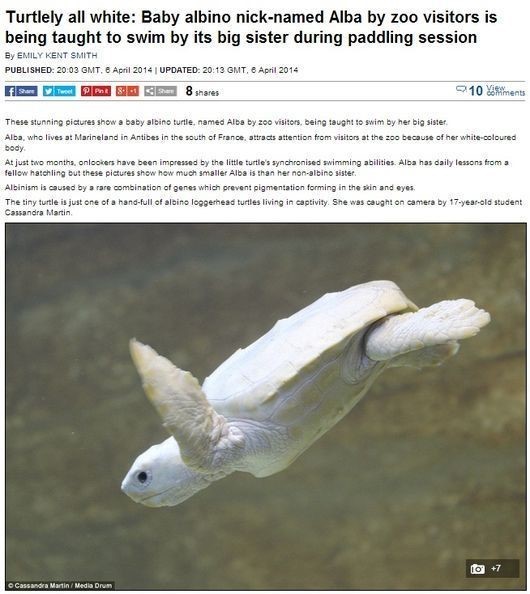 희귀 알비노 거북 '알바'는 일반 거북에 비해 몸집이 작으나 건강상 큰 문제는 없다고 한다.