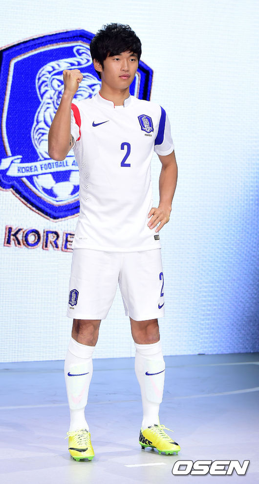 축구 국가대표 김진수가 원정 유니폼을 입고 포토타임을 갖고 있다.